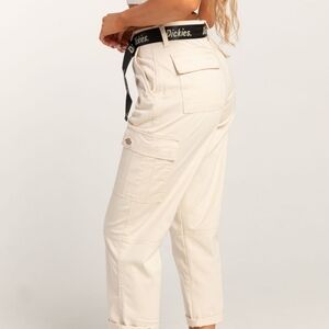 Dickies Roll Cuff Cargo Pants. Belted attached at wasit. Button front. Zip fly. Cargo pockets on sides. Slant hand pockets. Back patch pockets. Hook and loop closures. Approx. Inseam: 27.5" 98% Cotton 2% Spandex. Machine wash. Imported.