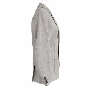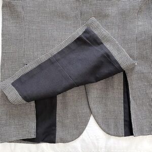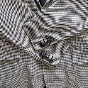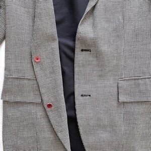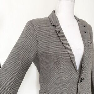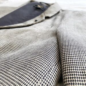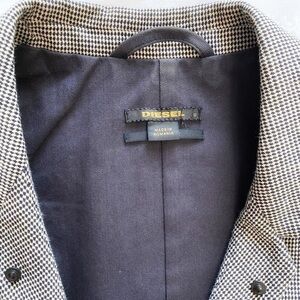DIESEL BLACK GOLD LABEL BLACK WHITE LINEN BLEND TEXTURED BUTTON FRONT BLAZER, a classic fit black and white patterned textured button front blazer with long sleeve and 4 buttons detail at cuffs - lined and not stretch - thick linen blend fabric - notch lapel collar with metallic detail on it - chest pocket - usable flap pockets - regular shoulder pads for a structured touch - Perfect modern trendy business or hipster look piece of clothing with long trouser pants or over a sheath dress.