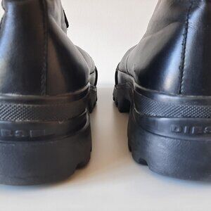 Diesel Black H-Vaiont Chz black leather boots with round toe and thick rubber sole to add some height. Front zipper with logo zipper tag. Boots are in great condition! Please note minor scratch to front toe of left boot (See picture).