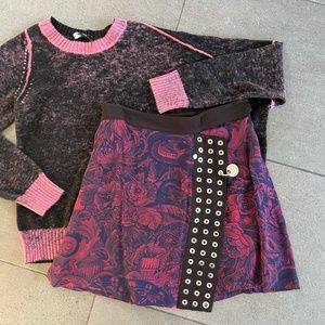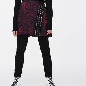 Navy-blue, burgundy and black skirt with a frill from Diesel. Fastened with velcro. Decorated with a pattern including a floral motif and an insert studded with metal elements including a pendant with an engraved logo inn silver.