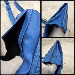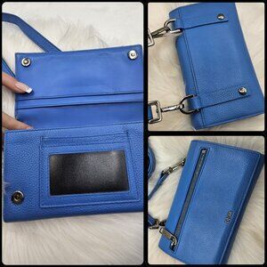 Crafted from blue leather , this compact wallet features a front zip flap, snap closure, exterior pocket, and a nylon-lined interior with three compartments and card slots.