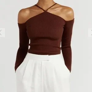 DISHH “Gianna Chocolate Rib Knit Top”. Small hole at the seam on the back - not noticeable & price reflects. Worn only a few times, no pilling & very soft fabric.