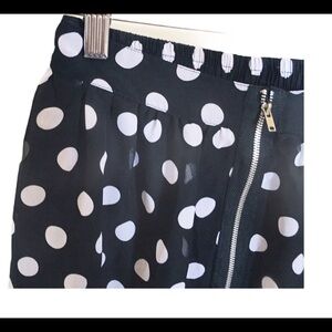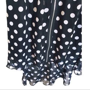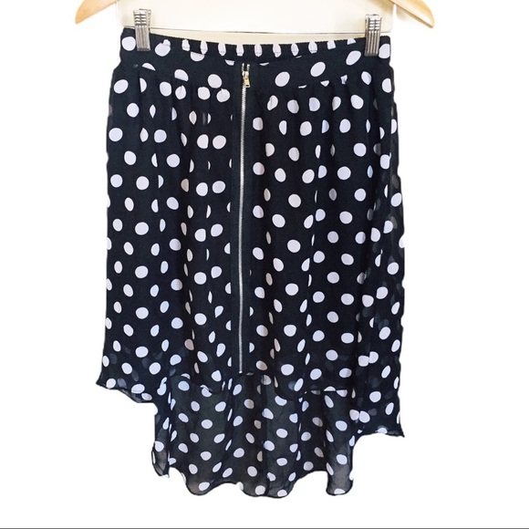 Black, Polka print, Sheer overlay, Hi Lo fit, Zipper front, Elasticated waistband