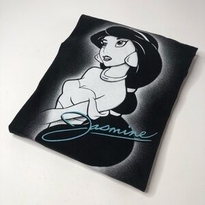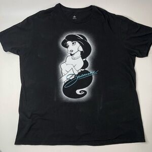 Disney Aladdin Princess Jasmine black graphic short sleeve loose t-shirt in a crew neck fit. Jasmine has a glowing affect around her in white and her name is written in cursive in a teal blue color. In excellent used condition with no flaws. Please see photos for measurements and details. Unisex size 2X.