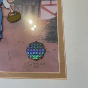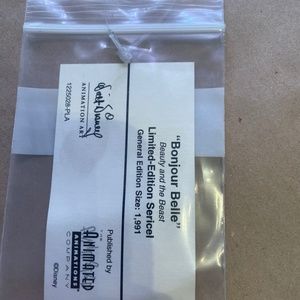 "BONJOUR BELL" SERICEL, with Certificate of Authenticity. Framed, beautiful Disney art! Edition size is 1991. This edition, "Bonjour Belle" is a progression of five Belle poses, based on animation drawings from Sequence 2, Scene 1. This sericel is a reproduction of a hand-inked, hand-painted animation cel master specially created by The Animated Animations Company and artists as the Walt Disney Studios Ink and Paint Department.Sixteen colors were used to recreate the color image.