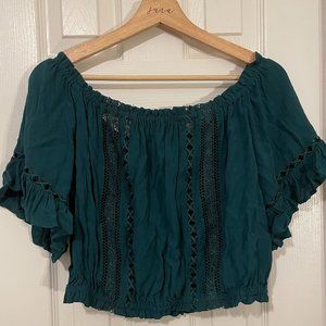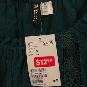Bought at H&M, new with tags. Deep green colour, with knit details and elastic waist. This billowy top has off-the-shoulder cap sleeves.
