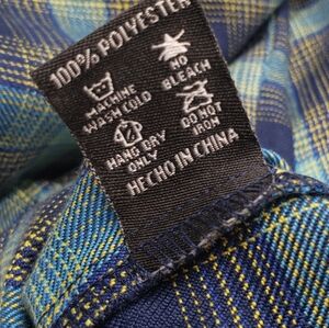 The Pende Jo shirt in a blue, green and yellow plaid. 100% polyester with Blue pearl snap close up front Button close cuffs