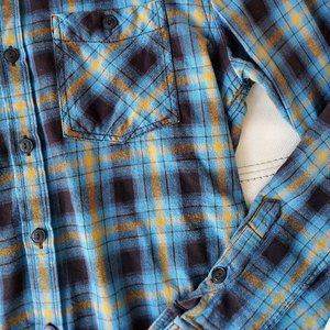 Blue checkered flannel DJAB shirt. Had a hood initially but my boyfriend took it off when he bought it because he liked the shirt better without it. Except that we can' t find it since then. In good used condition.