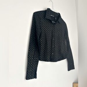Upper cute logo’d DKNY size small woman’s button up top! Stretchy!! Black & gold! Open to offers.