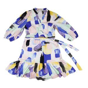Watercolour abstract printed dress by DKNY. 97% cotton, 3% spandex. Lined with polyester. Knee length with balloon half sleeves. Elastic in back of waist plus a belt. Great condition, no stains...very little wear. modern US size 10, see measurements in photos.