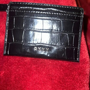 Sleek black card holder. Croc-embossed texture. Features DKNY logo.