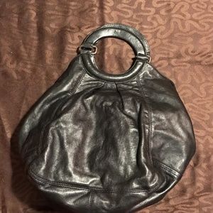 Sleek black leather hobo bag. Features dual zippers and round handles. Stylish and versatile.