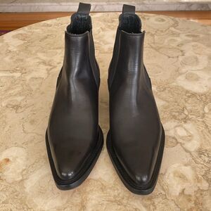 In excellent preowned condition with no scuffs or visible wear signs gorgeous DKNY black leather Chelsea boots featuring a sleek pointed toe and a Cuban heel. Elastic side panels, leather lined and leather soles. Made in Spain.