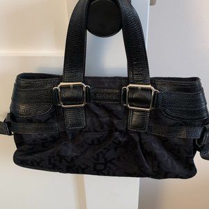 This darling little bag goes back to Y2K. It is from designer DKNY and is made of black canvas stamped DKNY and embossed black leather handles and trim. It measures about 12 (at widest 10 at smallest) x 6 x 3 inches with an open top with magnetic closure. Inside is a zip pocket and 2 open pockets. The handles are slightly adjustable.