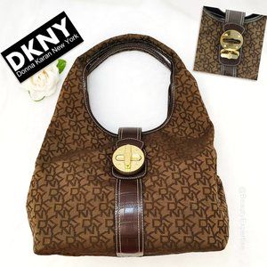 DKNY Brown Hobo Bag Monogram Jacquard Gold Buckle Turnlock Flap Shoulder…