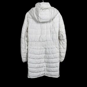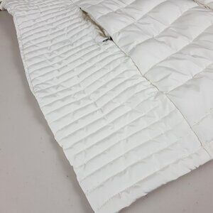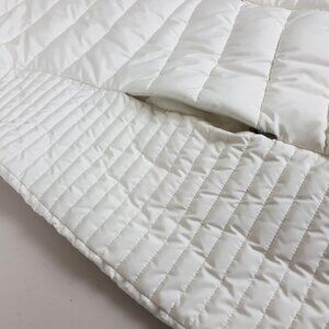 An elegant quilted puffer jacket in crisp white. It’s lightweight, easy to wear without feeling bulky, yet still provides cozy warmth in chilly weather. The ribbed side-panels cinch the waist, sculpting a flattering silhouette and provide flexibility for comfortable movement. Perfect for fall, winter and spring. Like new, excellent condition.