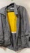 Sleek DKNY raincoat in charcoal. Features buttoned pockets and adjustable cuffs. Ideal for rainy days.