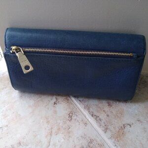 Dark blue wallet. Somewhat worn as you can see in the pictures like the metal, but creates a vintage look.