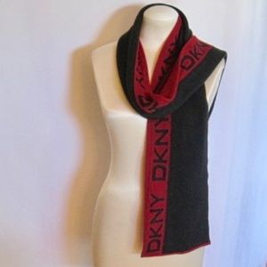 DKNY Donna Karan New York men's knit scarf. Colour: Charcoal Grey/Burgandy. Scarf features two tone colour blocking on the outer side and a solid textured finish on the inside and along one outside edge.Charcoal Grey DKNY logo detail. Fabric Content: 60% cotton, 40% Rayon. Scarf is new and has not been worn. NOTE: Due to inconsistencies with lighting sources and computer settings, the actual colour may vary from the images shown.