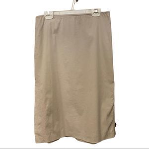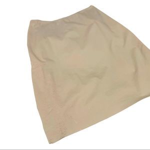 DKNY vintage designer skirt with beautiful delicate pink floral embroidery framing along the corner where the subtle slit in the skirt is placed.