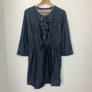 Soft chambray-style denim dress with a stunning sequined front panel and drawstring waist. Easy, throw-on style with a touch of glam! Relaxed fit with 3/4 length roll tab sleeves.