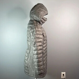 Ladies Grey Donna Karan New York DKNY Lightweight Packable 3/4 Length Hooded Poly Fill Puffer Jacket.