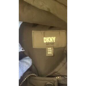 This is a DKNY long quilted puffer coat, tagged as a women's size XXL. It features a sleek black shell with warm polyester/Sorona insulation. Details include a full zip front with a snap-button storm flap, a hood, and zippered hand pockets. Perfect for cold winter weather.