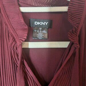 DKNY long-sleeve pleated chiffon babydoll shift dress with ribbon-tie keyhole neckline and ruffle collar. Tag says US 4, but would work for a size 6.
