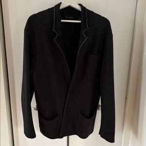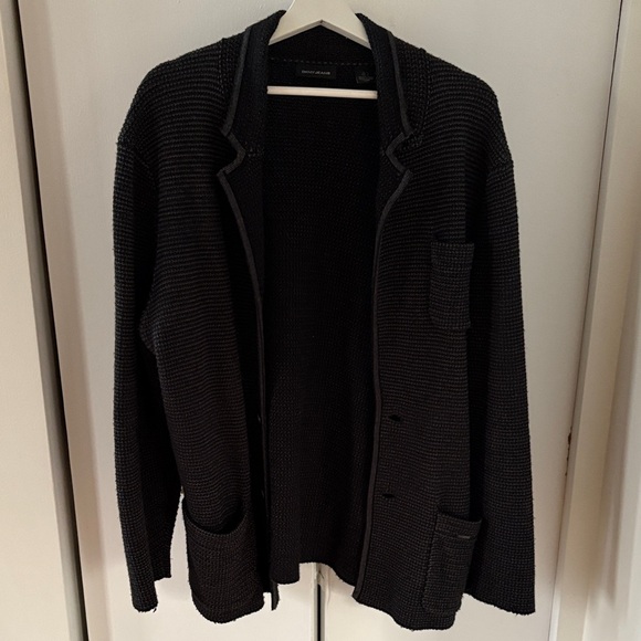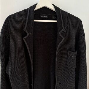 Sophisticated black cardigan with textured knit. Features front pockets and button closure. Ideal for layering.
