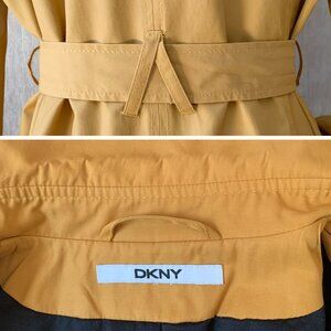 Make a statement in this vibrant and stylish mustard yellow DKNY trench coat. This trench is a modern take on a timeless classic featuring a classic double-breasted button front, removable self-tie belt to cinch the waist, two side pockets. Perfect for the transitional weather of spring and fall, this fully lined coat makes it a versatile piece for both casual outings and more dressed-up occasions.