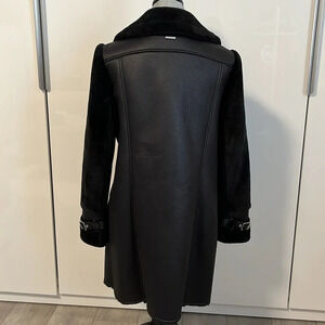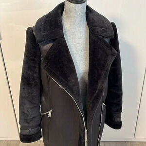 This gorgeous coat is made from Wool, polyester and spandex but looks like a real shearling and fur coat. The sleeves are made with faux fur with a nice stretch to make it easier to move around. A nice thick sturdy silver zipper closure and 2 front zipper pockets. Inside is faux fur. There is buckle detail on arms for a nice added touch. DKNY silver plate logo at back. This item is new never worn NWOT.