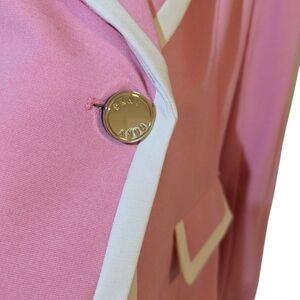 Elevate your style with this chic DKNY bubble gum pink blazer, featuring elegant ivory accents and beautiful gold hardware. Perfect for any occasion, this retro inspired blazer adds a touch of sophistication to your wardrobe.