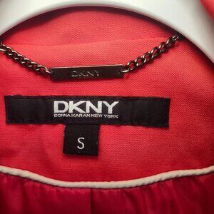 Keywords: DKNY red trench coat, Donna Karan coat, women’s trench coat, belted red coat, classic trench, size small, stylish outerwear, statement coat, chic women’s jacket.