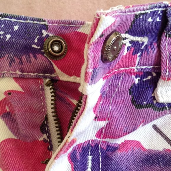 - Jeans are white with a pattern of large pink and purple flowers