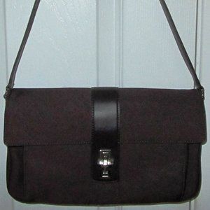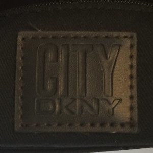 @superwasp Hi- The purse is not leather. Its brown matte soft material. The strap in the center of the bag with the clasp is leather and the straps are leather. There are no scratches on the purse or hardware. The silver closure clasp and the silver hardware on the straps both say DNNY. It was only used once for a special occasion. There is a full pocket on the back of the bag as shown in the last picture that is in leather and says CITY DKNY