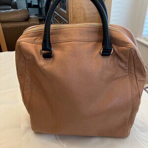 Lovely black-handled, caramel-coloured leather satchel made in India. Black shoulder strap is inside the bag. Never used. Original and sale tag included.