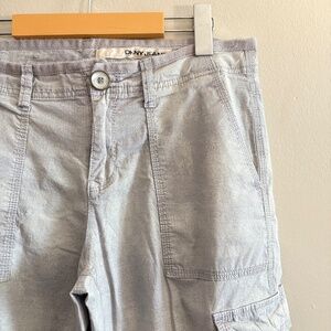 DKNY stone wash grey cargo capris in soft cotton with a relaxed, easy fit. Features classic pockets and subtle fading for a laid-back vibe.