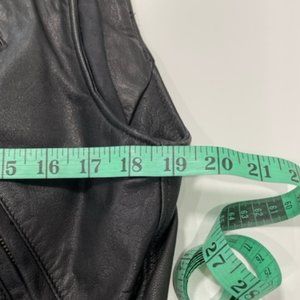 There are no scratches, marks or damage of any kind on the leather. This DKNY leather vest is rare and hard to find. I haven’t found another one to compare it too. See measurements in photo for best accuracy. View photos and video carefully as they are part of the description. Don't miss out on this fabulous leather vest.
