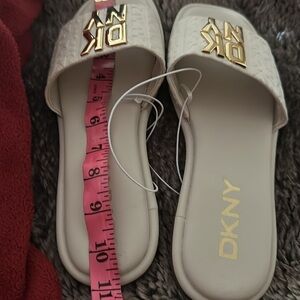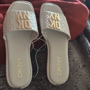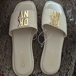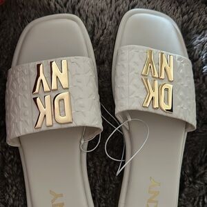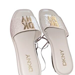 DKNY White Gold Logo Bling Slip On Flat Slides Sandals Size 6.5