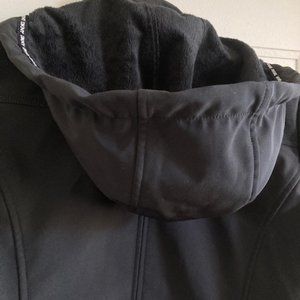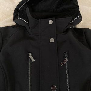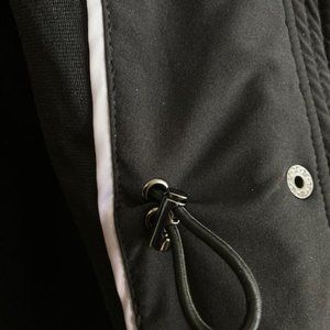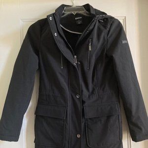 Nice, understated design, typical for DKNY. This rain jacket is in excellent condition. Polyester with polyester lining. As it's lined, it's more than a windbreaker-type garment, so more versatile and suitable for wear over three seasons. (I placed this in the trench coat category as there is no rainwear category, and this would be worn in similar fashion. In black, so even more versatile.