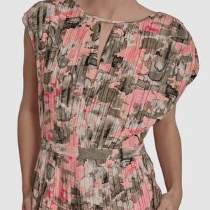 The DKNY Women's Pink Printed Crewneck Pleated Blouse Top in size XS is a stylish and versatile piece for any woman's wardrobe. Made from a comfortable and easy-care fabric of rayon and nylon, this sleeveless top features a unique camouflage pattern, kimono sleeves, and a flattering relaxed fit. The pleated accents and keyhole neckline add a touch of elegance, making it perfect for layering or wearing on its own during the summer, fall, or spring seasons. The vibrant multicolor design and limited edition status make it a standout addition to any outfit.