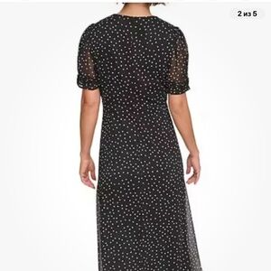 DKNY Womens Short Sleeve V-Neck Empire Waist Midi Black White Polka Dot