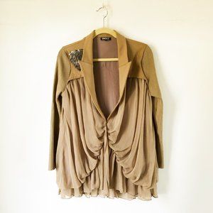 • Rib knit sleeves, gathered silk chiffon bodice.