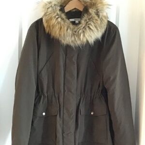 Dark khaki coloured winter parka. Size xl. NWT. Removable fur trim on hood. Drawstring on waist. Four front pockets. Stand up collar . Full zipper snap closing. Pit 2 pit is 22”. Length of sleeve is 26”. Length of coat is 29” in front and slightly longer in back. 100% polyester . In excellent shape.