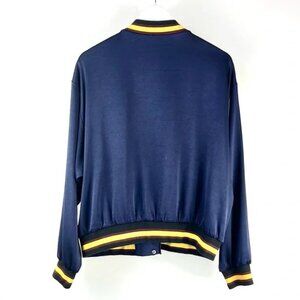 Released for the 2014 Fall season, this luxe varsity bomber from the #CaraD4DKNY collaboration between DKNY and Cara Delevingne is made in a Midnight navy satin back crepe; and is trimmed with a striped ribbing in hues of black, burgundy, and yellow. It features long sleeves, ribbed cuffs, a ribbed stand-up collar, a snap front placket, front black leather-trimmed welt pockets, a banded ribbed hem, and is lined in a yellow stretch crepe.