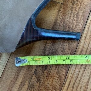 Suede leather upper with round toe and inside zipper. Heeled ankle boots. Size 10. In good pre-loved condition. Right toe has a bit of wear and right heel has a scrape along it about 1/2” in length (could be hidden with a repair pencil I think but I didn’t have one so haven’t tried). Soles are in great shape.
