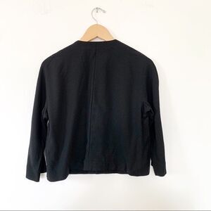 Unique chic minimalist black wool blazer would make a great addition to a work wardrobe. The blazer is mostly open but does have one clip at the top. Sleeves are wide and 3/4 length. Round neckline. Two side slit pockets and one hidden inside breast pocket. Blazer is lightweight and reminiscent of linen material.