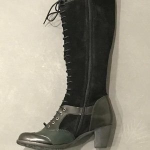 Dkode brand black and green heel laced up boot made with suede and leather.