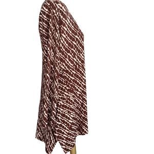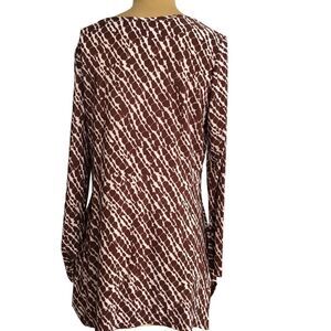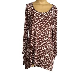 Maroon and white print, polyester spandex, XL, long sleeve, asymmetrical hem, round neck, stretchy, EUC, neck to hem 23”, armpit to armpit 20”, armpit to cuff 20”.