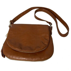 DLG Cognac Brown Faux Leather Saddle Bag Crossbody Purse Adjustable Strap Zips